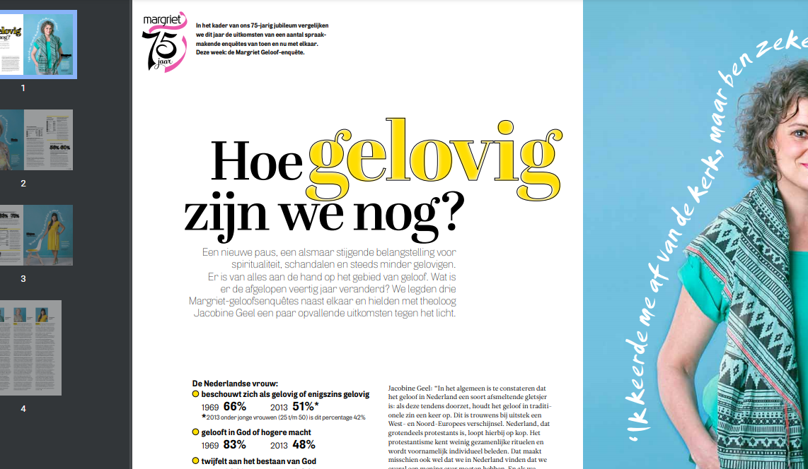 Een nieuwe paus, een alsmaar stijgende belangstelling voor spiritualiteit, schandalen en steeds minder gelovigen. Er is van alles aan de hand op het gebied van geloof. Wat is er de afgelopen 40 jaar veranderd? We onderzocht het via de Margriet geloof enquete. En houden samen met theoloog Jacobine Geel een paar opvallende uitkomsten tegen het licht.